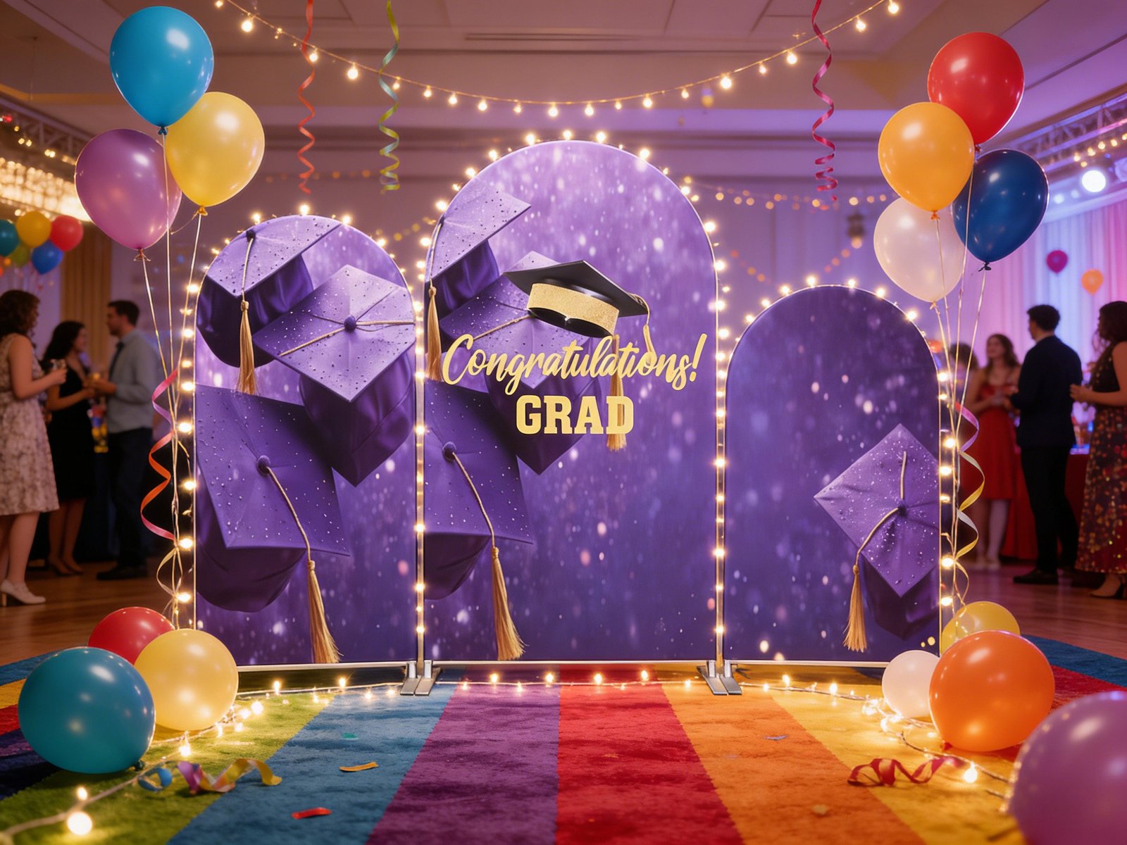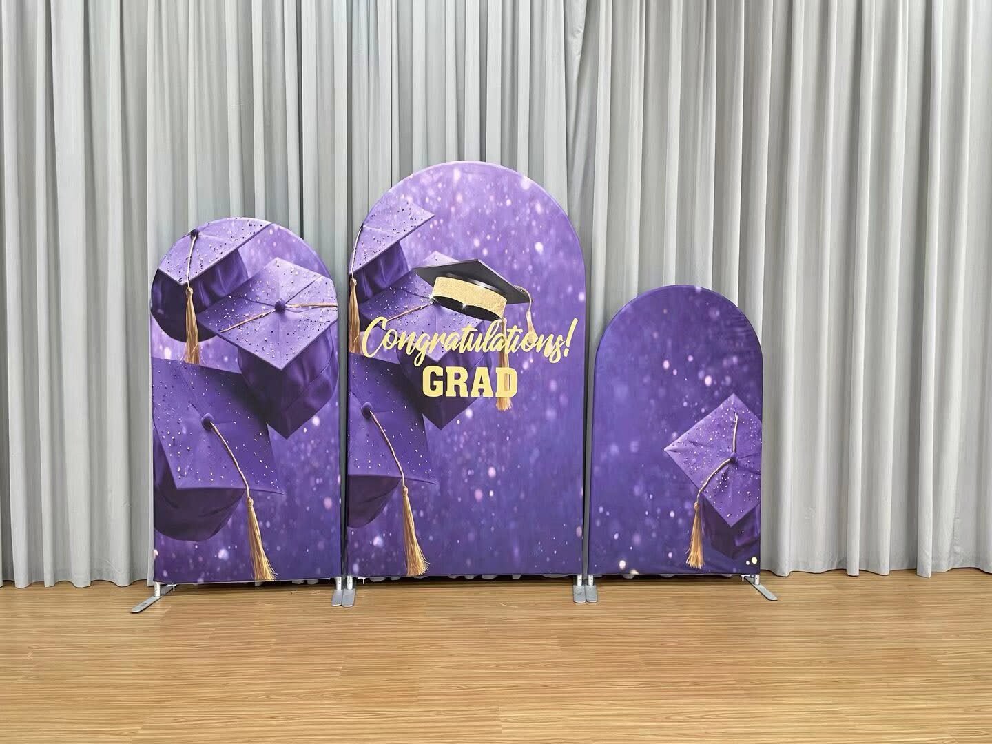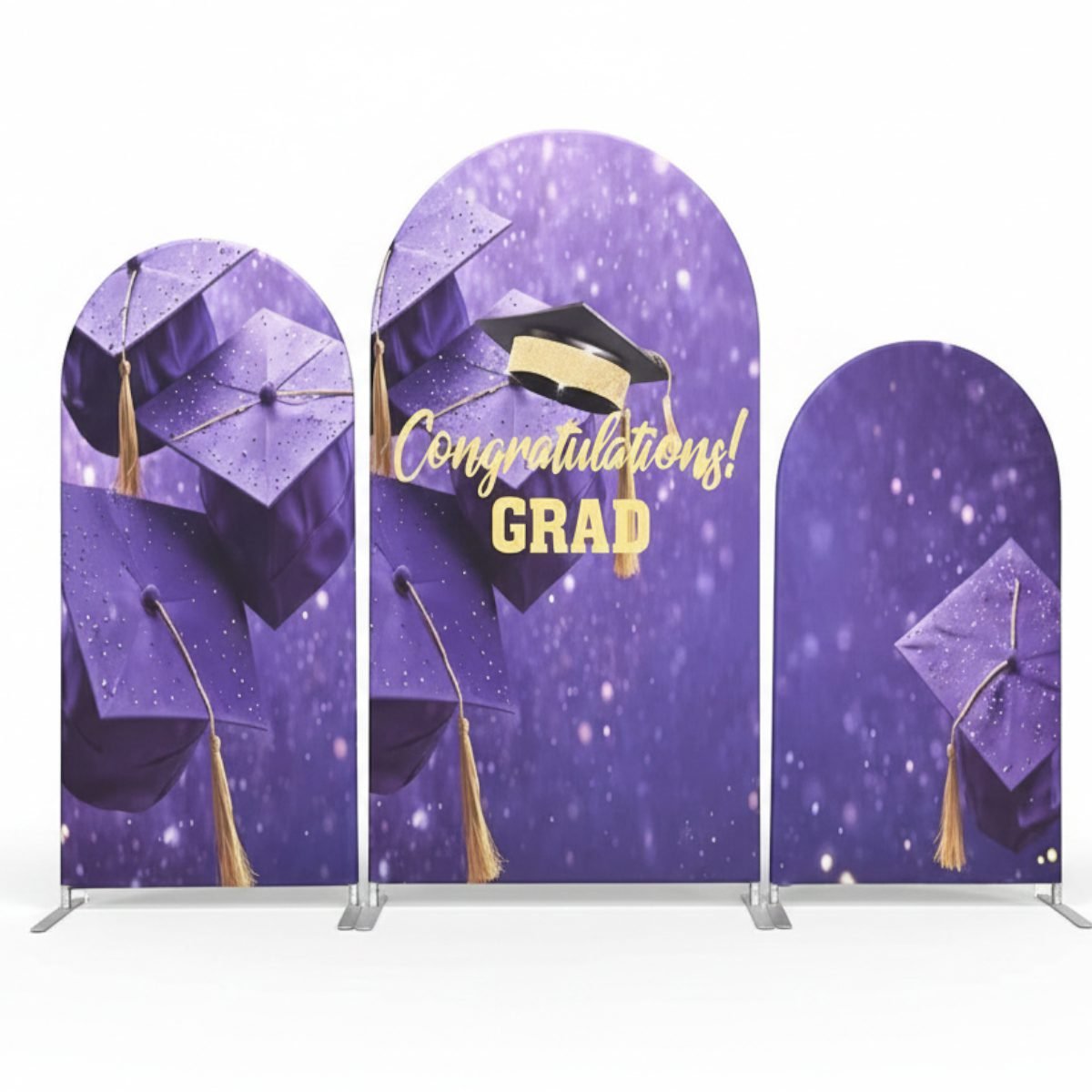 Celebrate your graduate’s milestone with our 3-Panel Graduation Arch Backdrop Set! Featuring a shimmering purple glitter background, graduation caps with gold tassels, and a bold “Congratulations! GRAD” message, this backdrop creates a festive, photo-ready focal point. Crafted from durable, wrinkle-resistant stretch spandex, it fits snugly over standard arch frames (stands not included) for a seamless finish. Perfect for high school/college graduations, graduation parties, and photo booths—capturing proud, memorable moments for your special day!