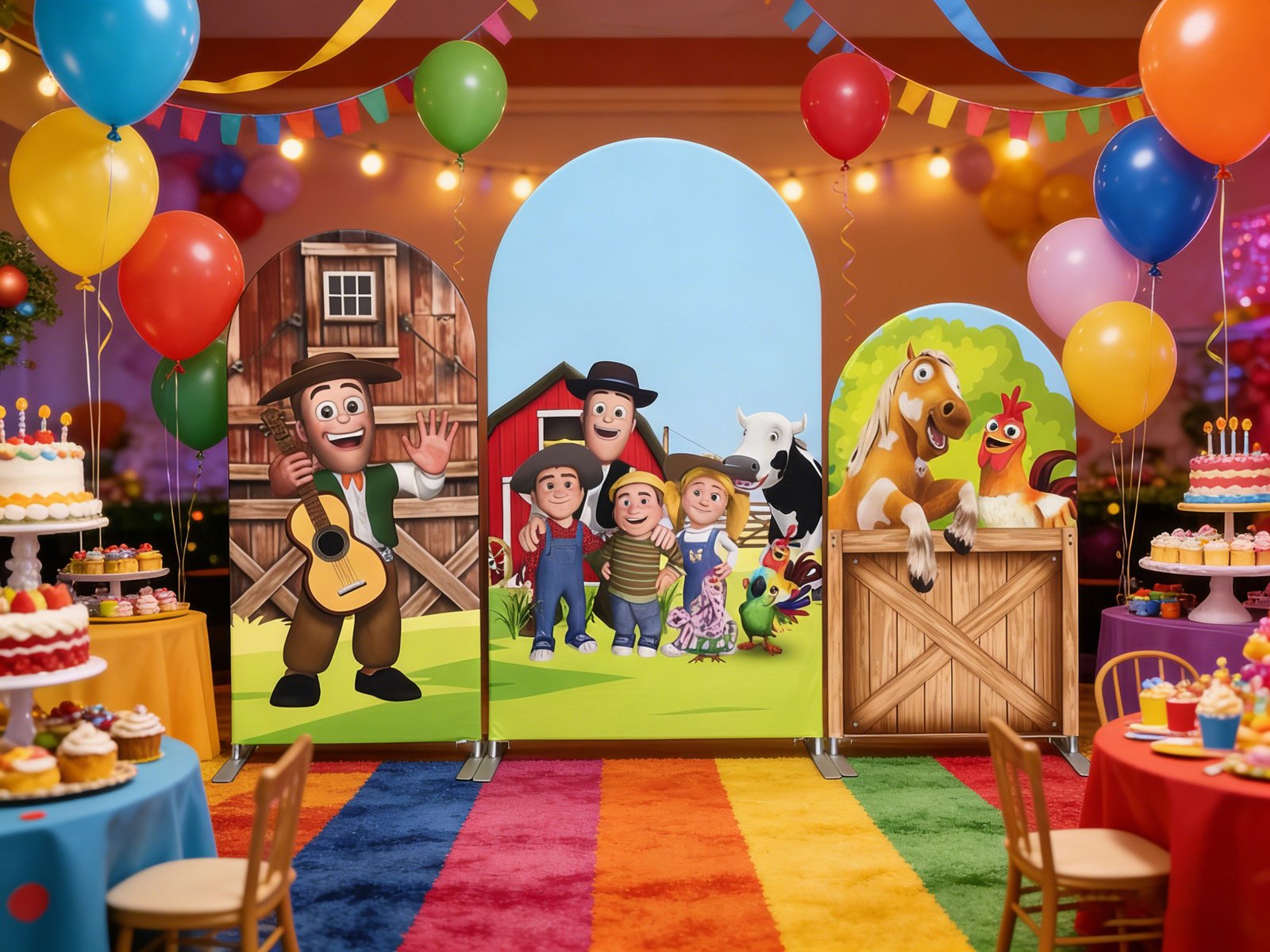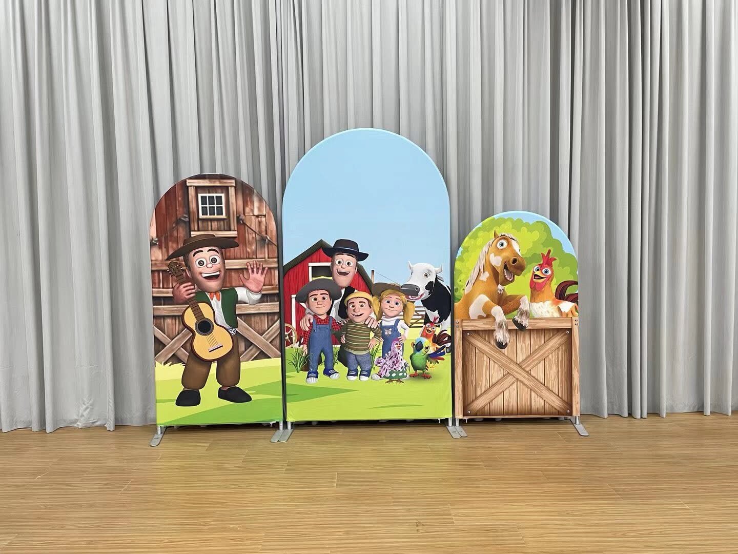 Bring rustic farm fun to your celebration with this 3-Panel Farm Barnyard Arch Backdrop! Boasting vibrant prints of farm characters, barns, horses, chickens, and cows against a sunny countryside scene, it’s ideal for farm-themed parties. Made from wrinkle-resistant stretch spandex, it fits standard arch frames (not included) for a seamless, photo-ready finish—perfect for kids’ birthdays, barnyard events, and photo booths!
