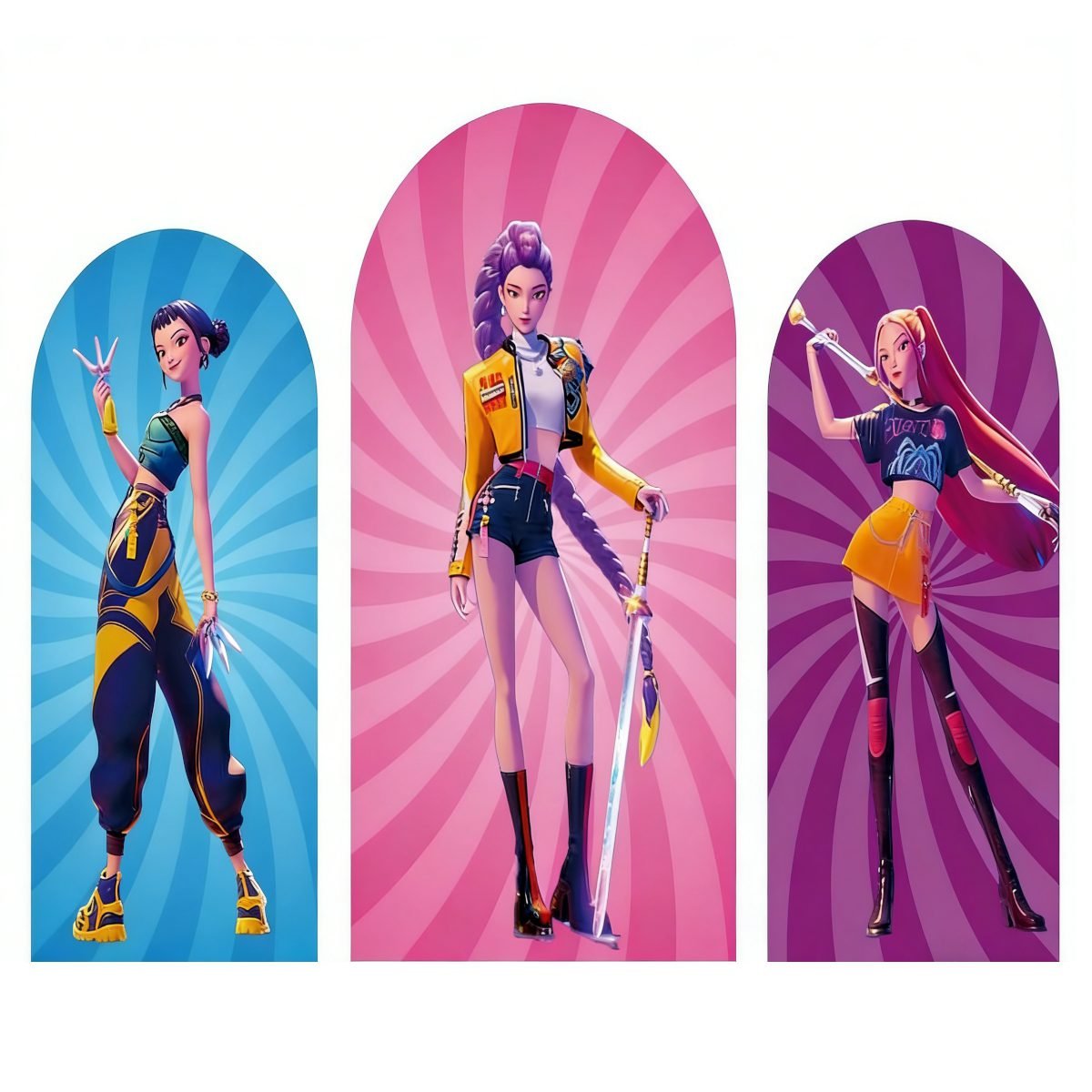 Make your next event unforgettable with our premium Chiara Arch Backdrop Covers. Featuring the high-octane K-Pop Demon Hunters theme, this 3-piece set is perfect for music-inspired celebrations, anime-style birthday parties, or neon-themed photo booths. Each cover is designed to slide seamlessly over standard arched metal frames, providing a professional and vibrant focal point for your décor.