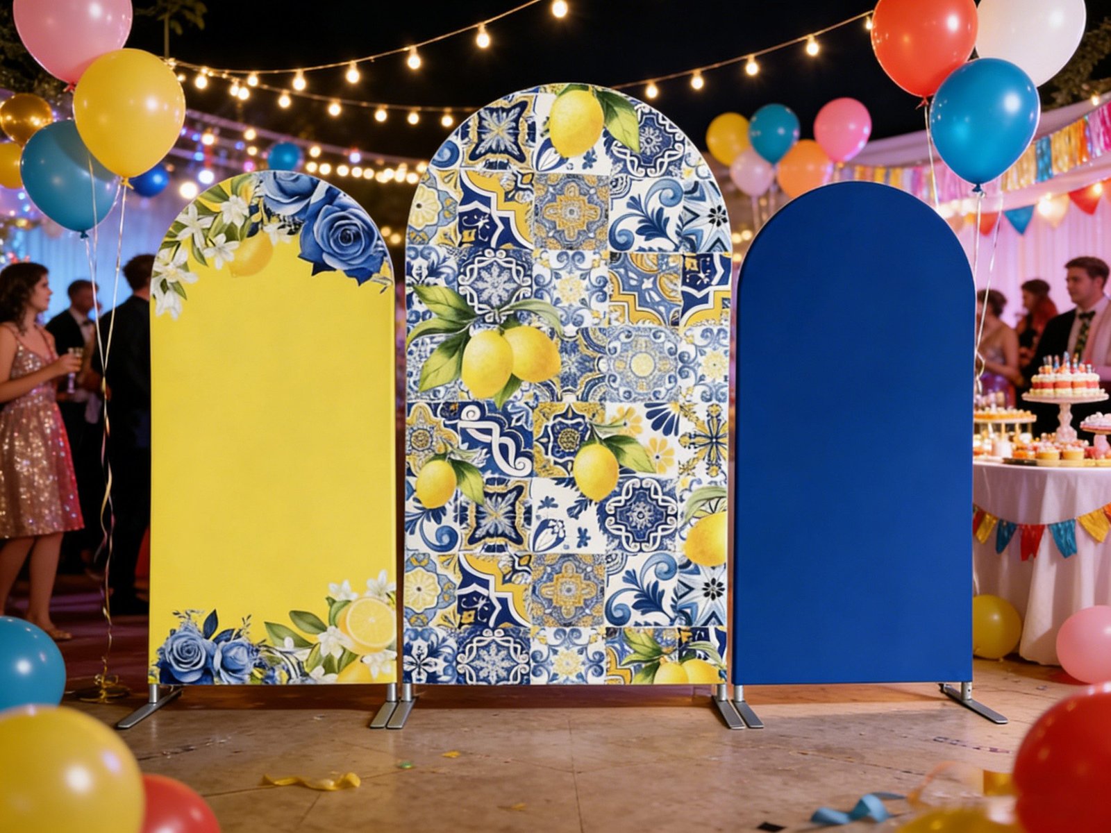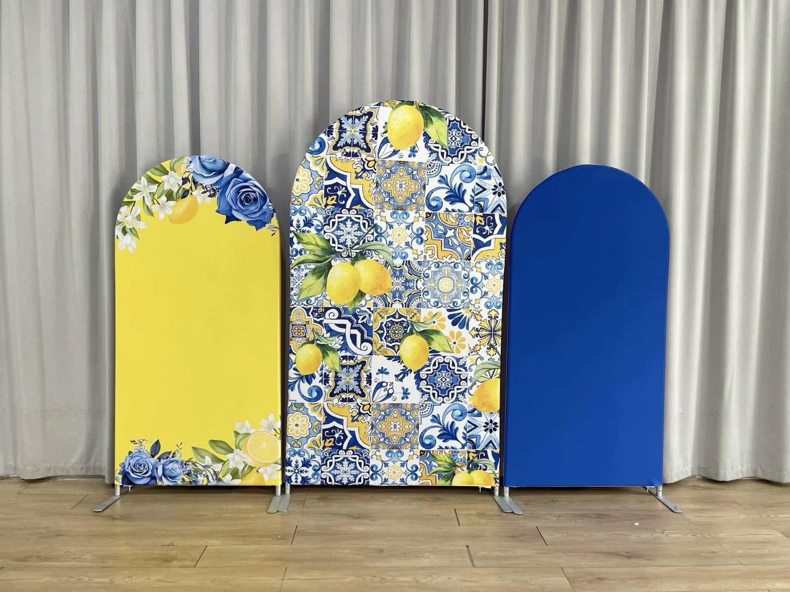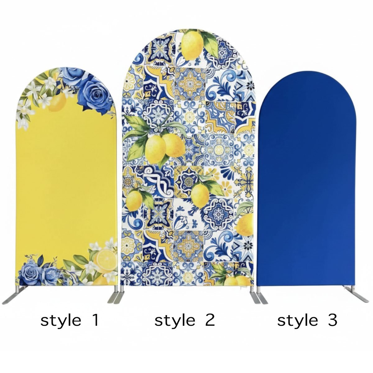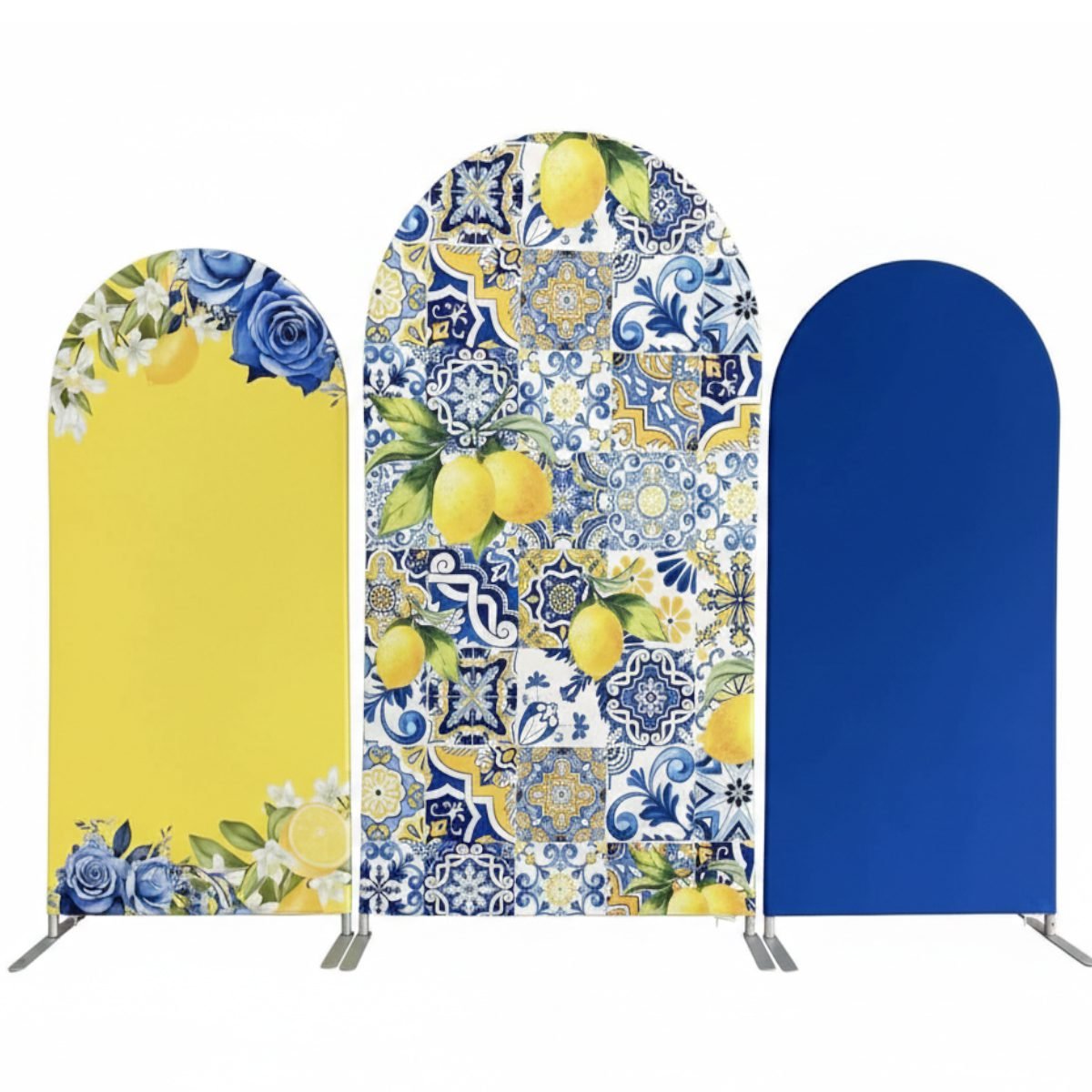 Bring a fresh Mediterranean vibe to your event with our 3-Panel Lemon & Blue Tile Arch Backdrop Set! Featuring vibrant yellow lemons, intricate blue-and-white tile patterns, and elegant blue rose accents, this backdrop blends citrusy charm with classic Mediterranean aesthetics. Crafted from durable, wrinkle-resistant stretch spandex, it fits snugly over standard arch frames (stands not included) for a seamless, photo-ready finish. Perfect for bridal showers, baby showers, summer parties, and photo booths—add a sunny, coastal touch to your celebration!