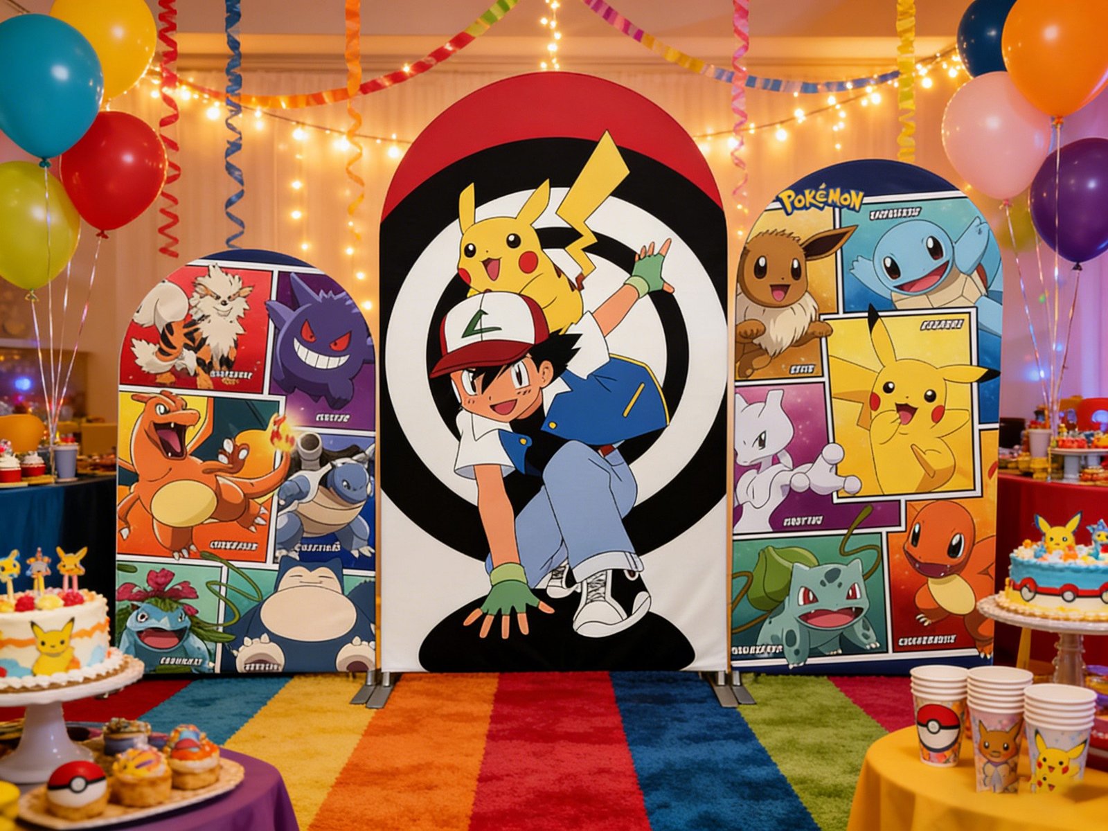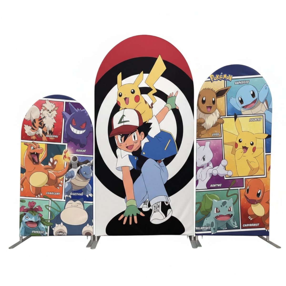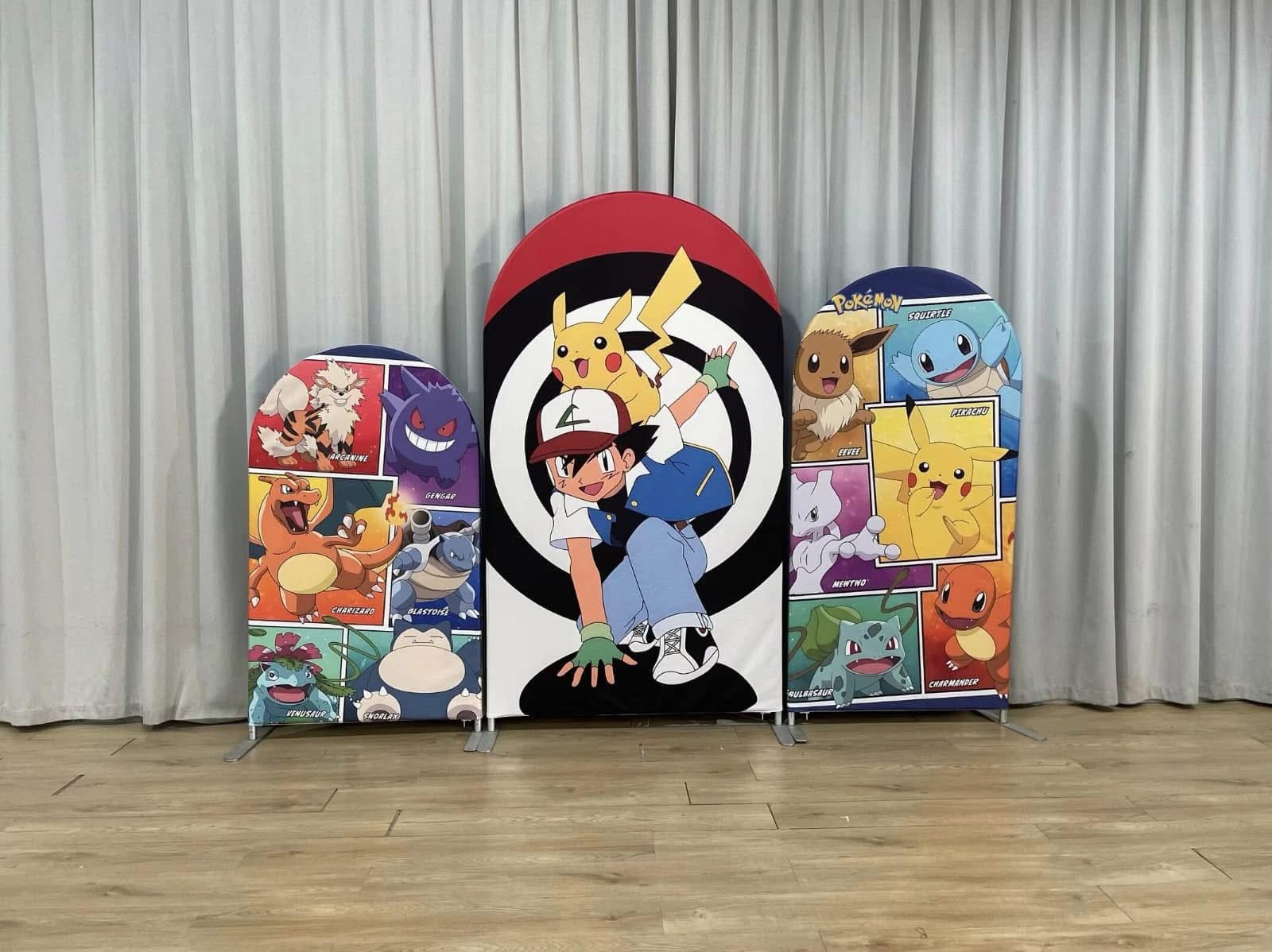 Gotta catch ’em all with this vibrant Pokémon-themed 3-piece arched backdrop set. Featuring a large center panel with Ash Ketchum and Pikachu against a Poké Ball motif, flanked by character collages including Charizard, Blastoise, and Mewtwo. These elasticated Chiara covers are perfect for kids’ video game birthday parties and anime-themed events. Made from high-quality tension fabric, they provide a smooth, professional background for the ultimate Pokémon photo booth experience.