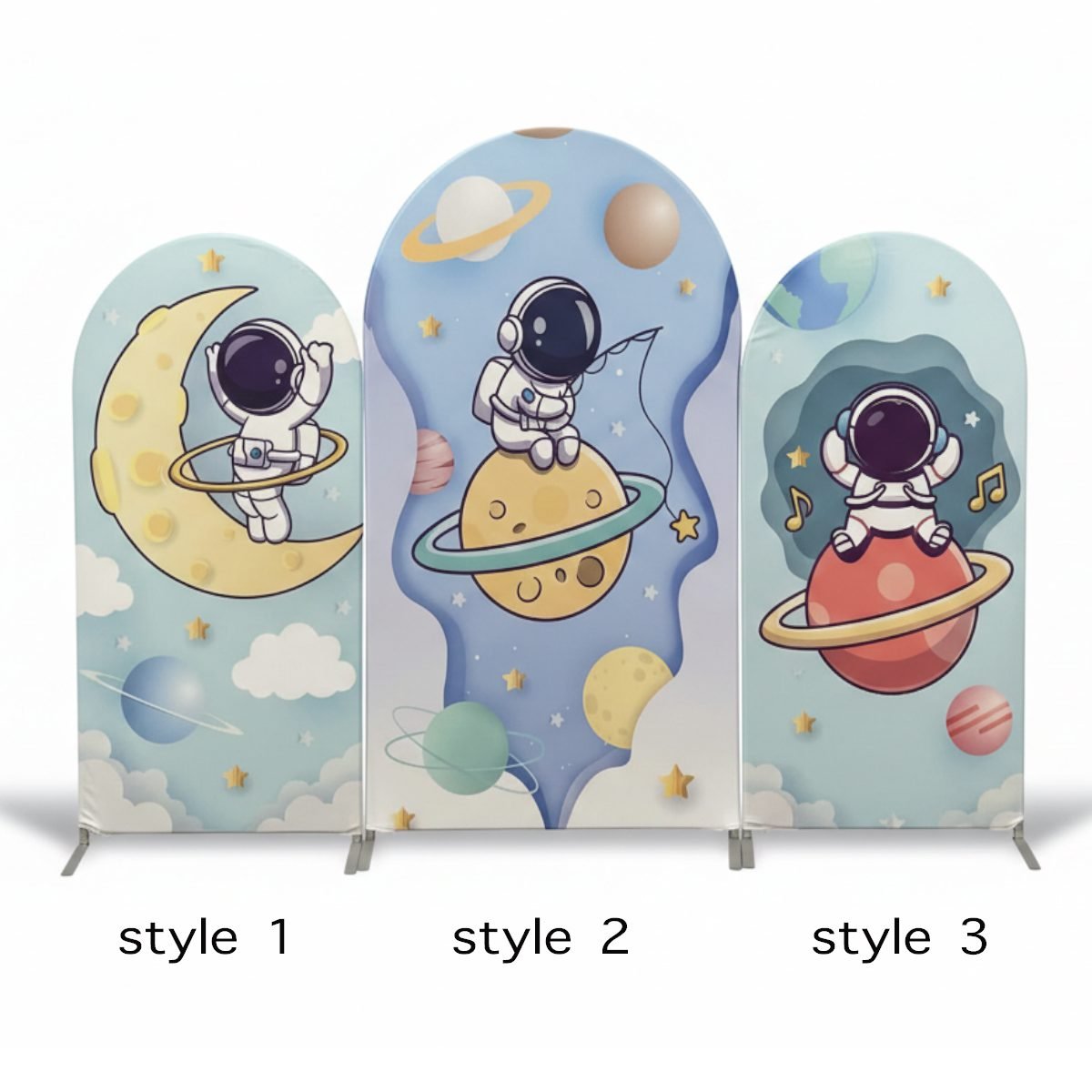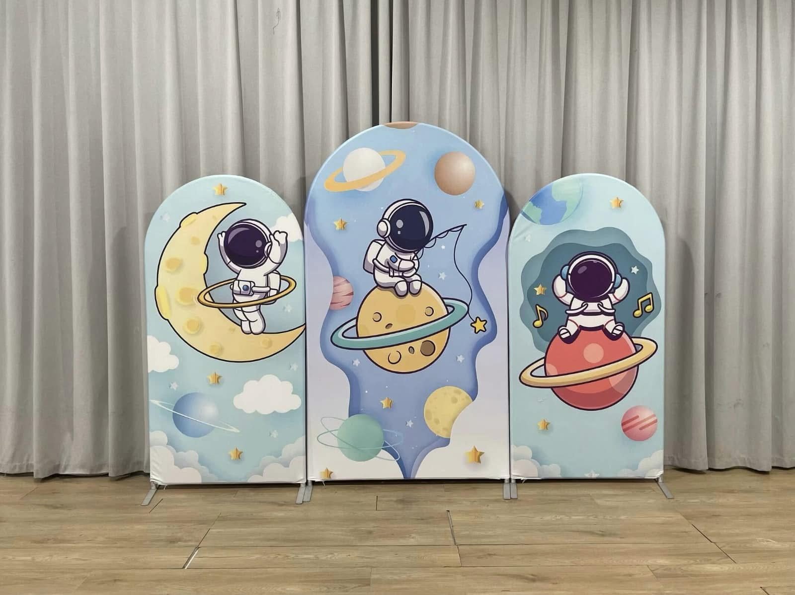 Blast off into a world of wonder with our Space Astronaut Arch Backdrop Set. This charming 3-piece collection features adorable illustrations of a little spaceman exploring the galaxy, sitting on the moon, and relaxing among colorful planets and stars. These high-quality elastic Chiara wall covers are made from premium tension fabric, ensuring a smooth, wrinkle-free fit over your arched frames. Perfect for astronaut-themed birthday parties, baby showers, and “Two the Moon” celebrations, this outer space photo booth background creates a magical, out-of-this-world atmosphere for your little explorer’s big day!