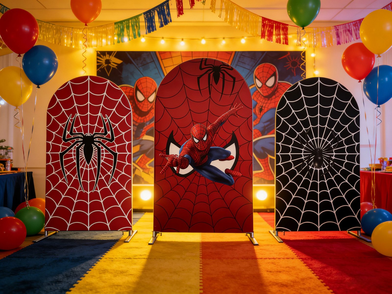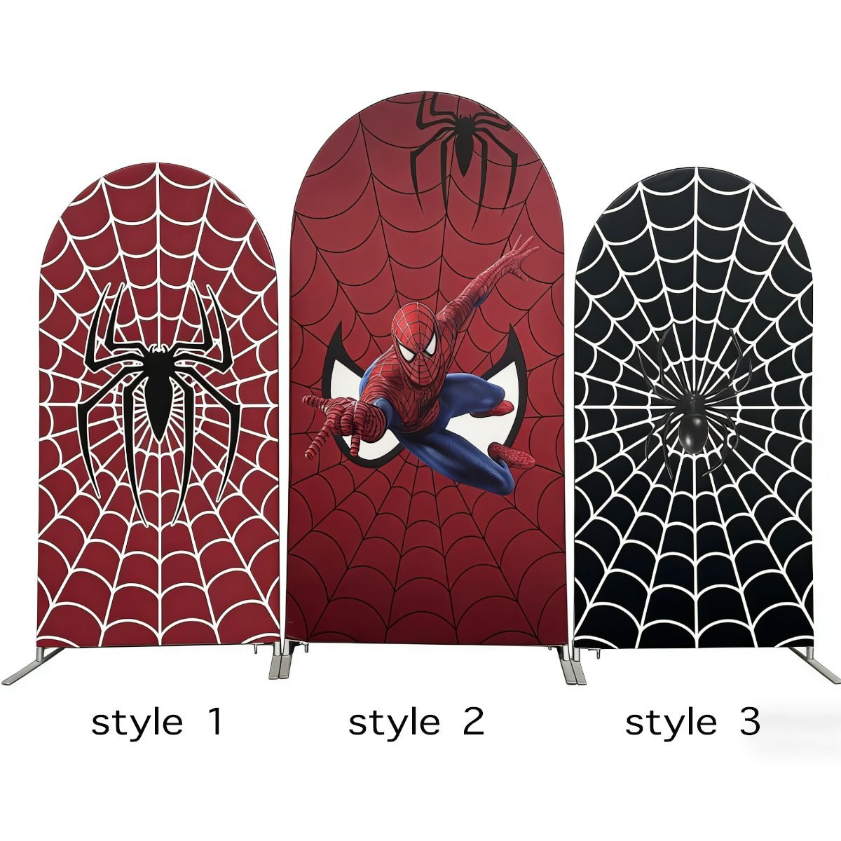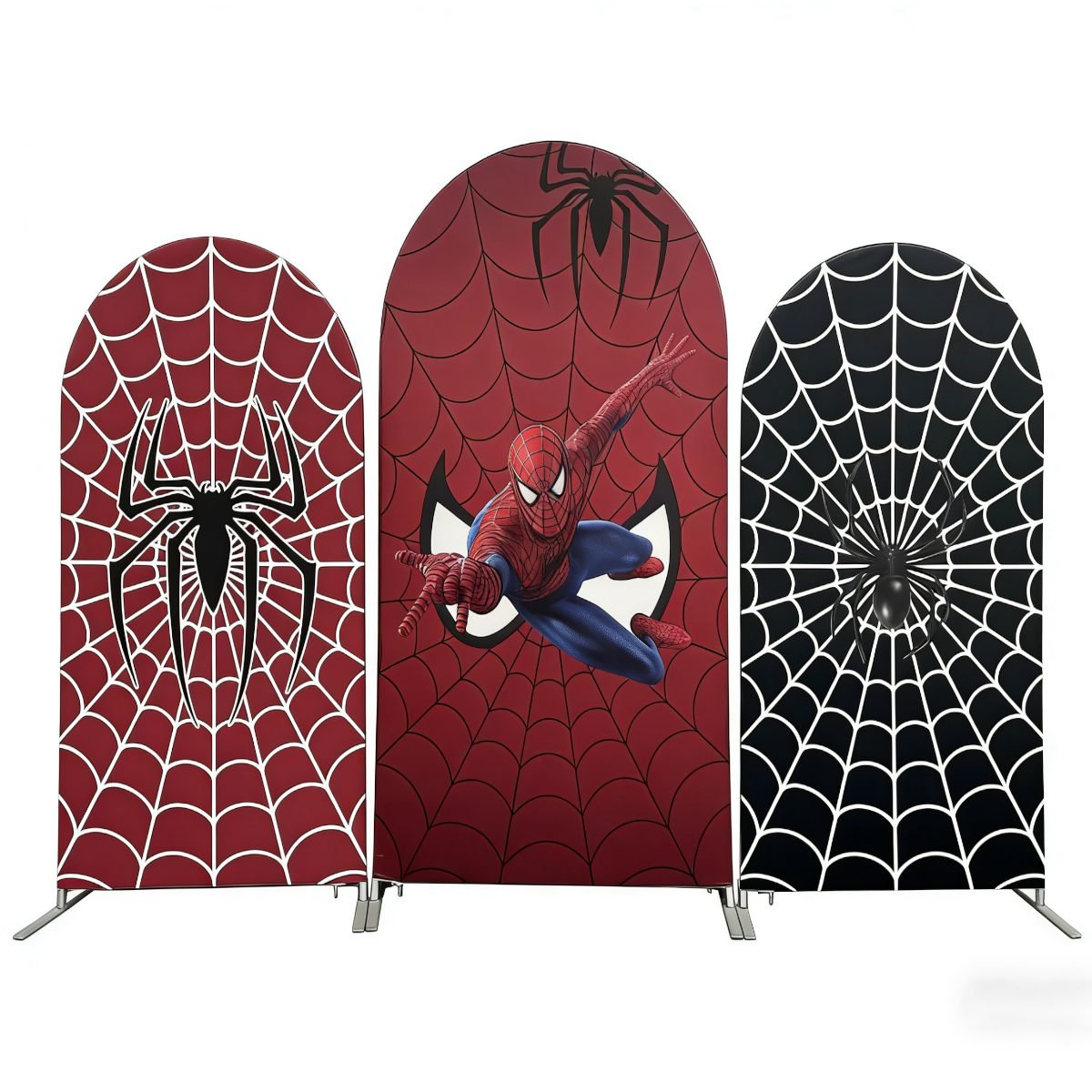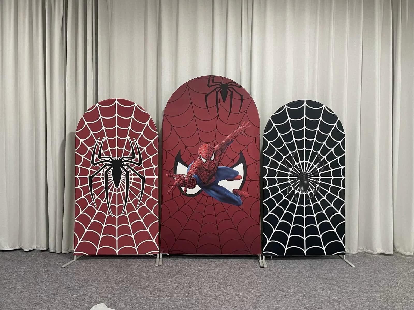 Swing into action with the ultimate Spider-Man 3-piece arch backdrop set, perfect for any young hero’s celebration. This high-impact collection features a central panel with Spider-Man in a dynamic mid-air pose, flanked by two coordinating panels featuring bold black and white spider logos over intricate red and black web patterns. These premium elastic Chiara wall covers are crafted from high-quality tension fabric, ensuring a smooth, wrinkle-free fit for your arched frames. Ideal for superhero-themed birthday parties, Marvel fan events, and professional photo booth setups, this vibrant set creates a heroic and immersive atmosphere