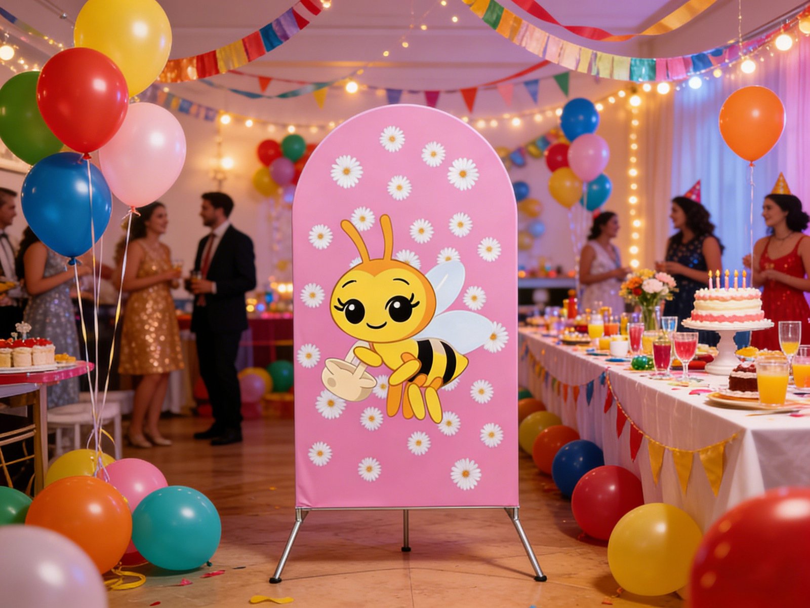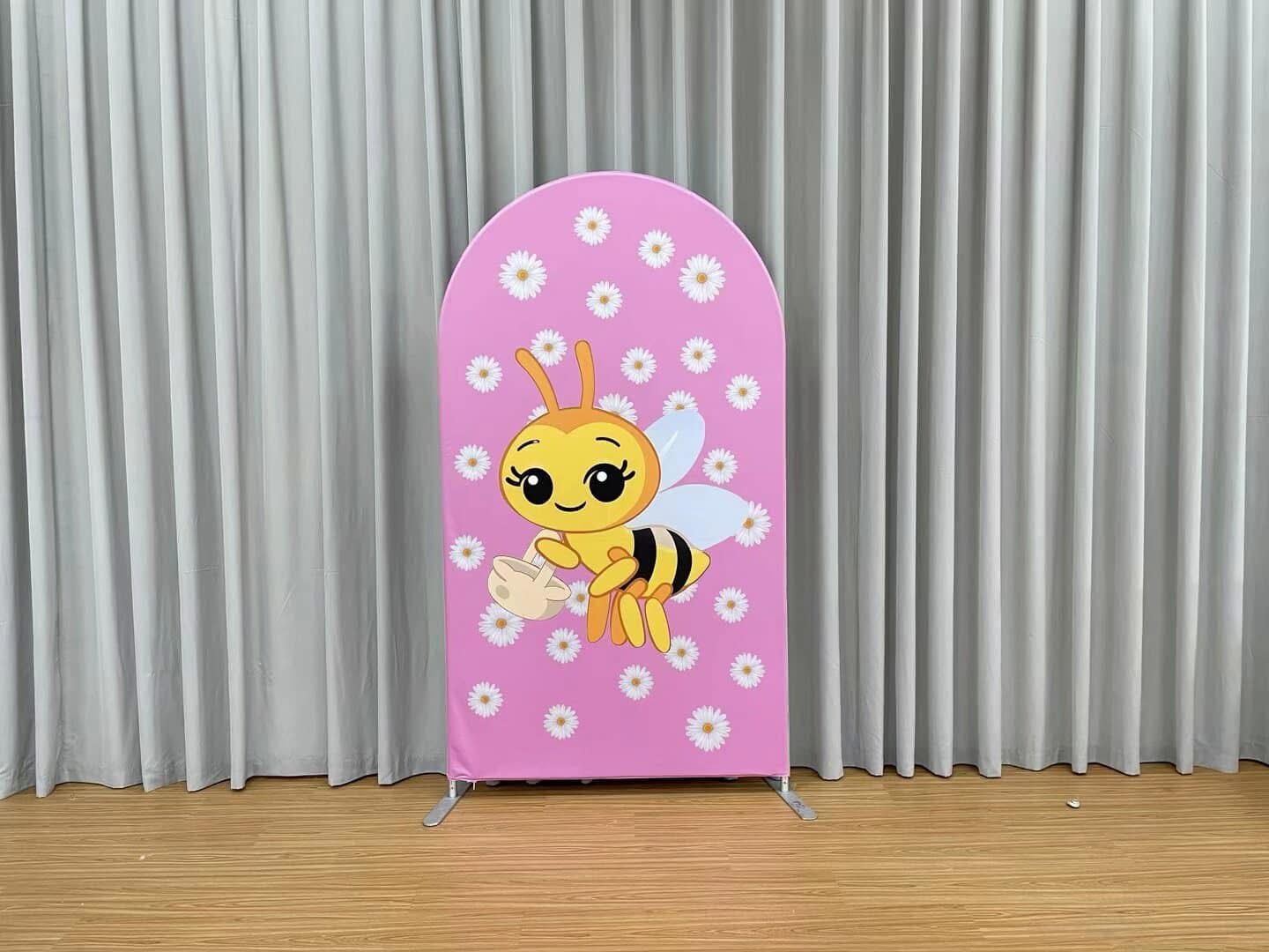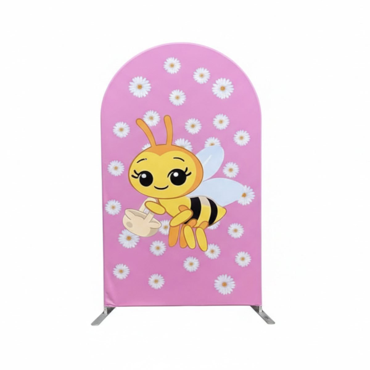 Create a buzz at your next celebration with our “Sweet as Can Bee” Arch Backdrop Cover. This charming Chiara wall decoration features an adorable smiling honeybee carrying a flower basket, set against a lovely pink background scattered with white daisy flowers. Perfect for “Mommy to Bee” baby showers, first birthday parties, and spring-themed events, this high-quality elastic tension fabric cover fits snugly over arched frames for a smooth, professional look. Whether you’re hosting a garden party or a sweet girl’s birthday, this bee-themed photo booth background adds a whimsical and heartwarming touch to your decor!